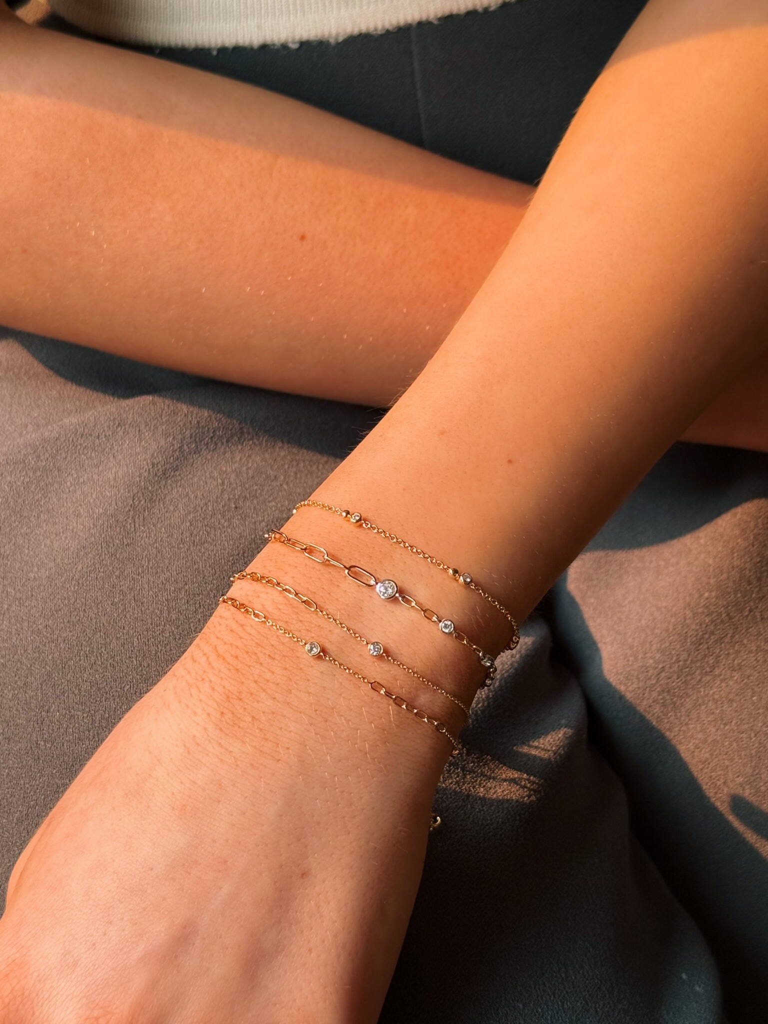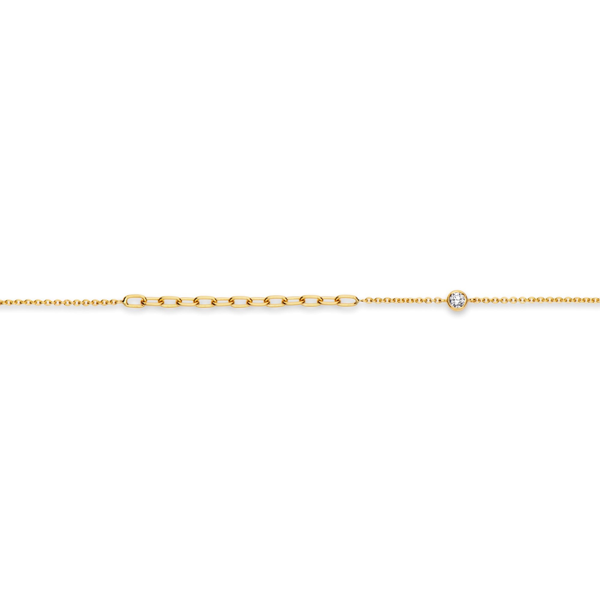 Diamond-accented bracelet of contemporary styling. The bracelet is crafted in 18k yellow gold and secures with a lobster clasp for safety. It is set with one natural round brilliant cut diamond that is bezel set into the alternating link pattern. This diamond has a weight of 0.04ct, clarity of SI-1 and color of FG. The width of the bracelet is 1.20mm wide and the length is 7 inches. The bracelet also includes length adjusters which allow the bracelet to be worn at 6.5 inches and 6 inches.