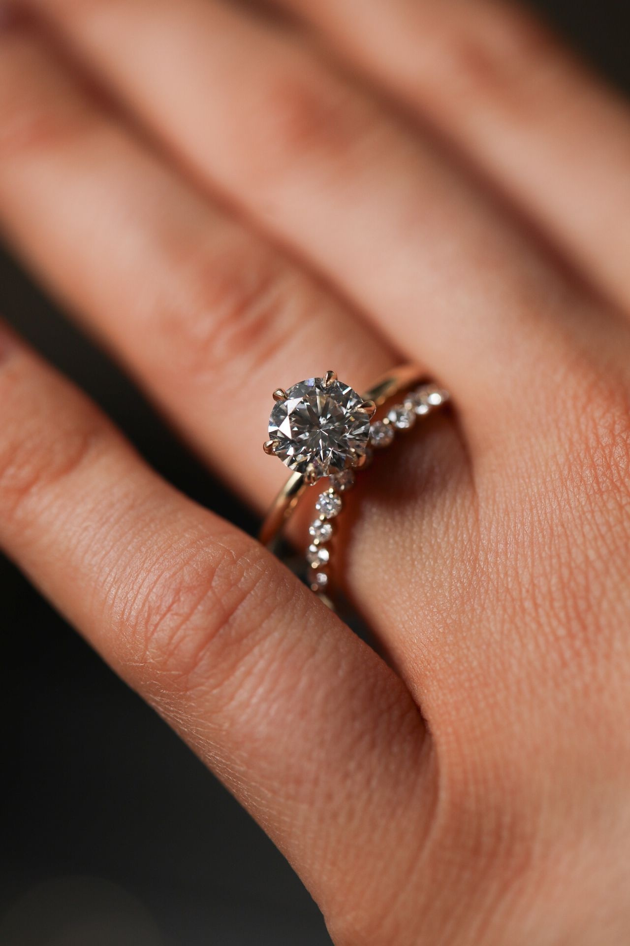 Diamond curve band crafted in 18k yellow gold. The band is set with 13 natural, round brilliant cut diamonds that are single claw set in a delicate curve pattern across the top. These diamonds taper in size and have a combined weight of 0.33ct. They are VS-2 to SI-1 in clarity and FG in color. The remaining shank, under the finger, measures 1.45mm in width, is rounded in shape and high polish in appearance.