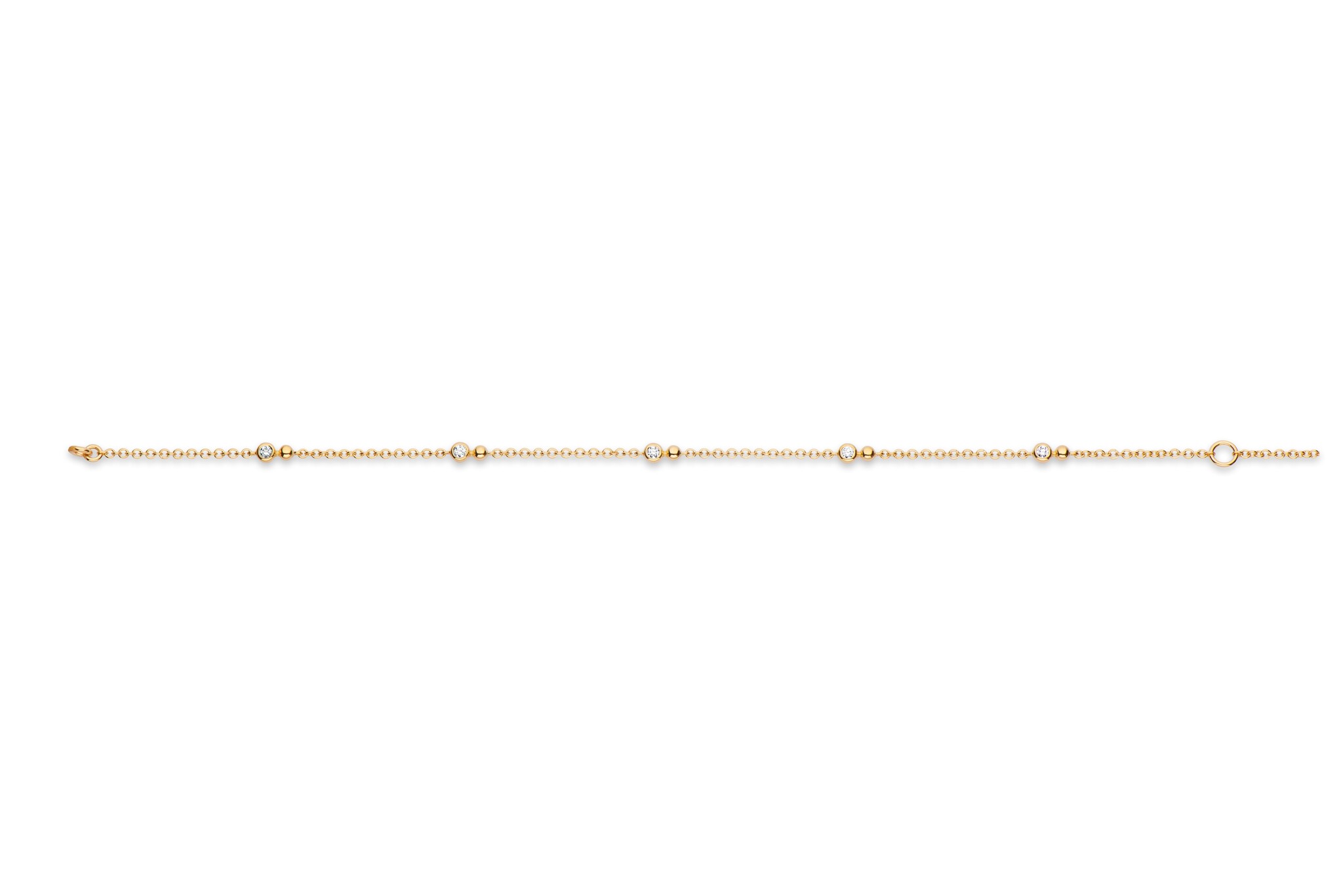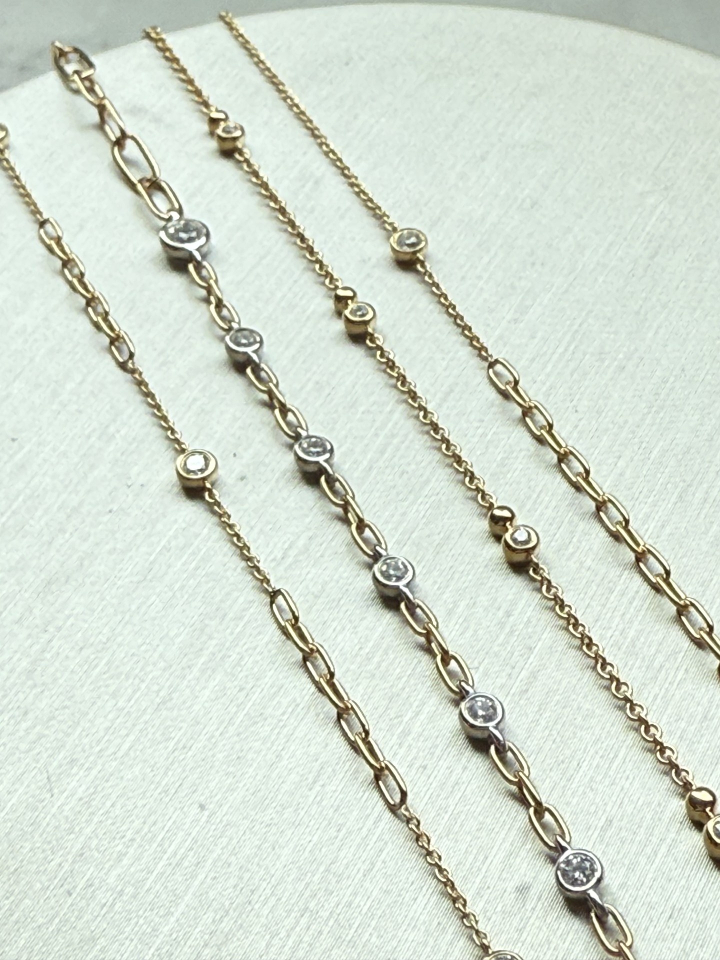 Diamonds by the yard bracelet of classic contemporary styling. The bracelet is crafted in 18k yellow gold and secures with a lobster clasp for safety. It is set with five natural round brilliant cut diamonds that are bezel set into the rolo style links. These diamonds have a combined weight of 0.07ct, clarity of SI-1 and color of FG. The width of the bracelet is 0.80mm wide and the length is 7 inches. The bracelet also includes length adjusters which allow the bracelet to be worn at 6.5 inches and 6 inches.