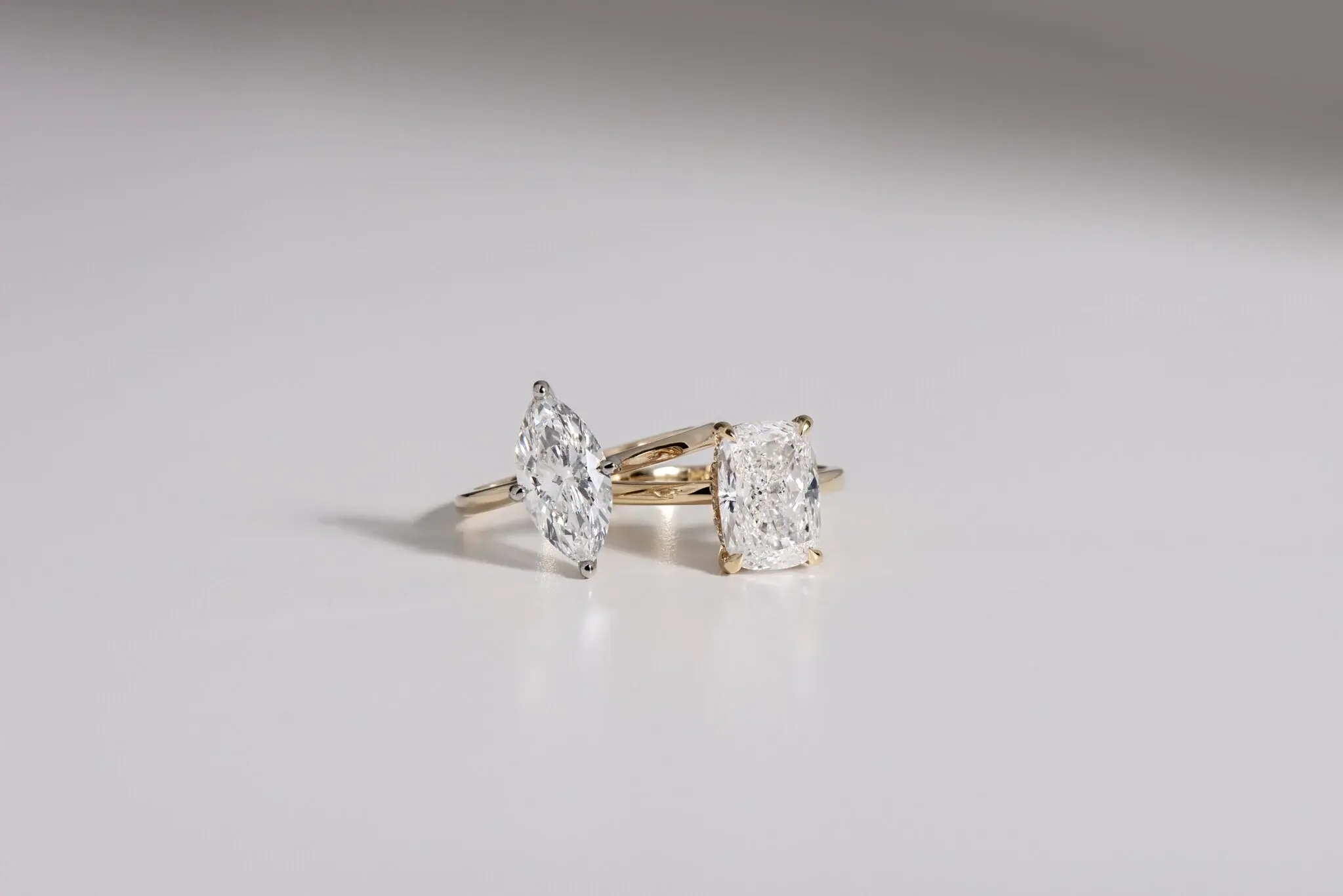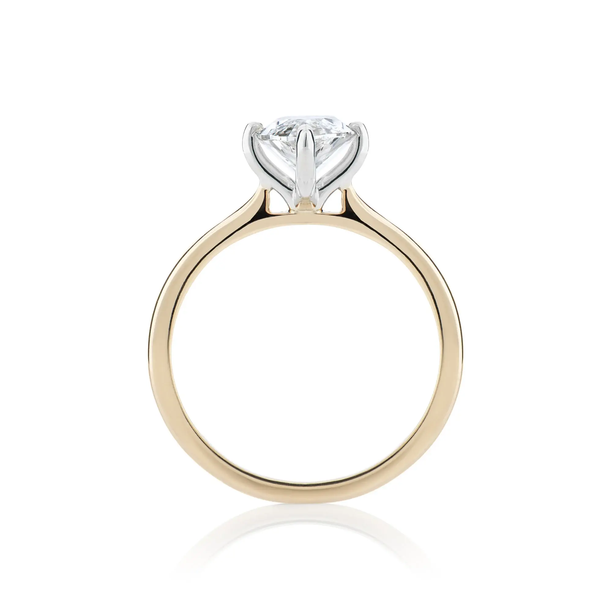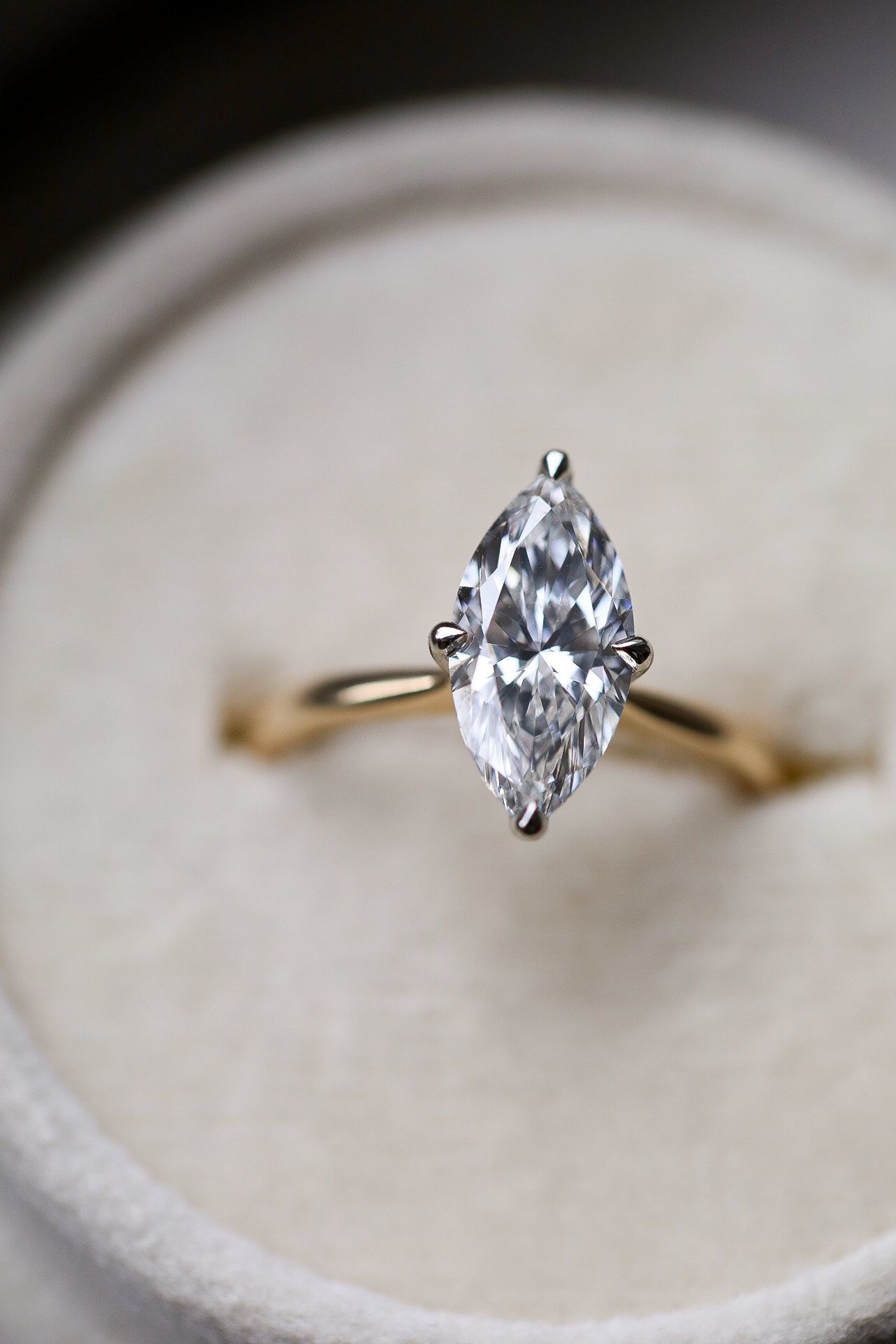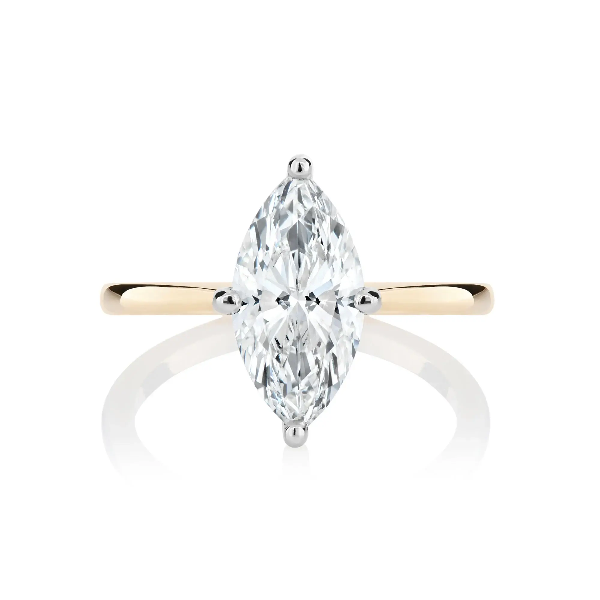Introducing LAB by Minichiello. Our expertly curated lab created diamond engagement ring and fine jewellery collection. The Eloise marquise cut diamond solitaire engagement ring is one of the elegant and timeless designs. Set with a lab created, marquise cut diamond at center with a weight of 2.06ct. This diamond is VVS2 in clarity and D in colour with an Excellent cut. This setting is crafted in a combination of 14k yellow and white gold and is high polish in appearance.