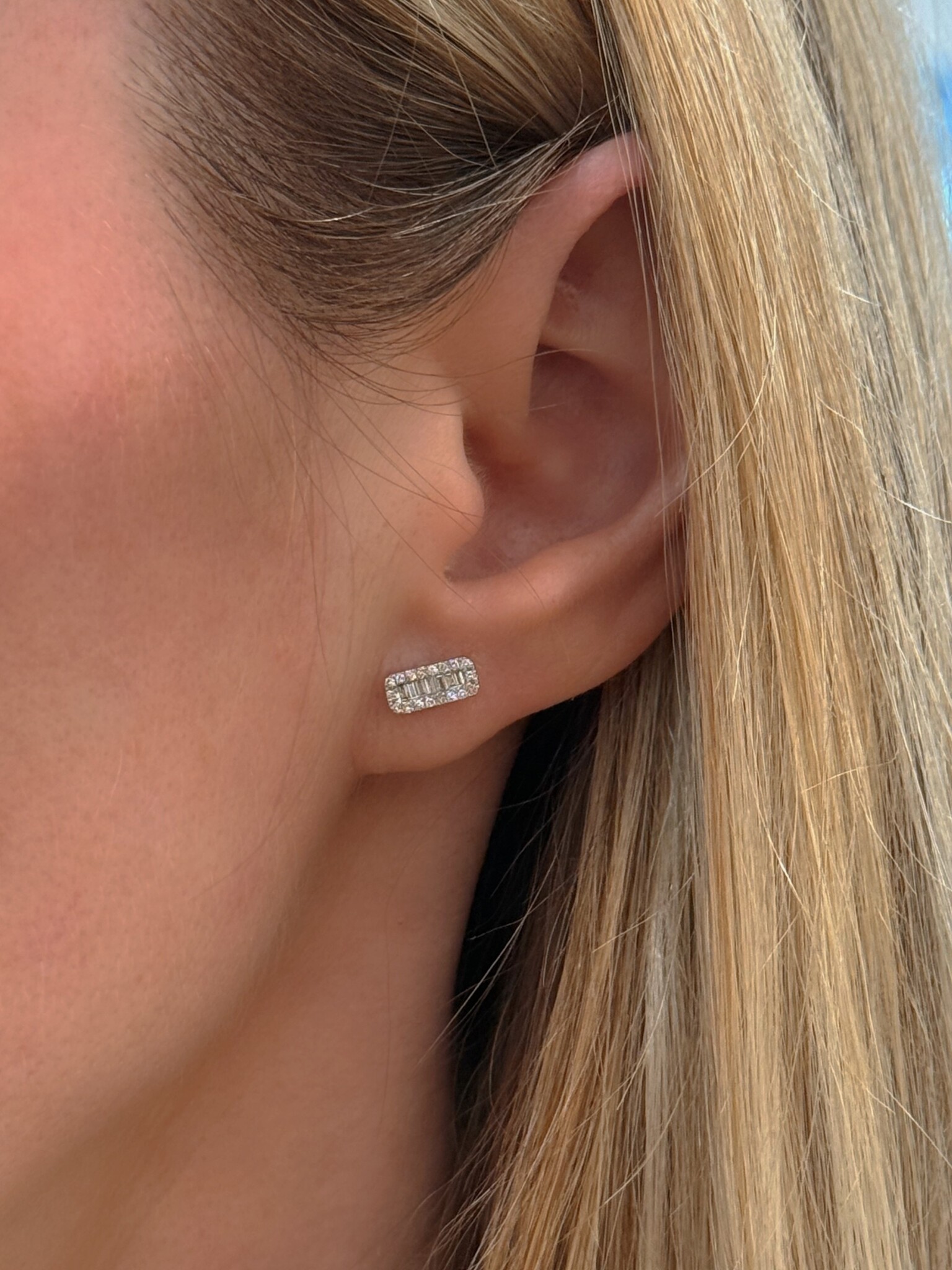 Ladies diamond bar earrings of classic contemporary styling. The earrings are crafted in 14k white gold and secure with post and butterfly backings. They are set with a combination of round and baguette cut diamonds that are micro pave set.