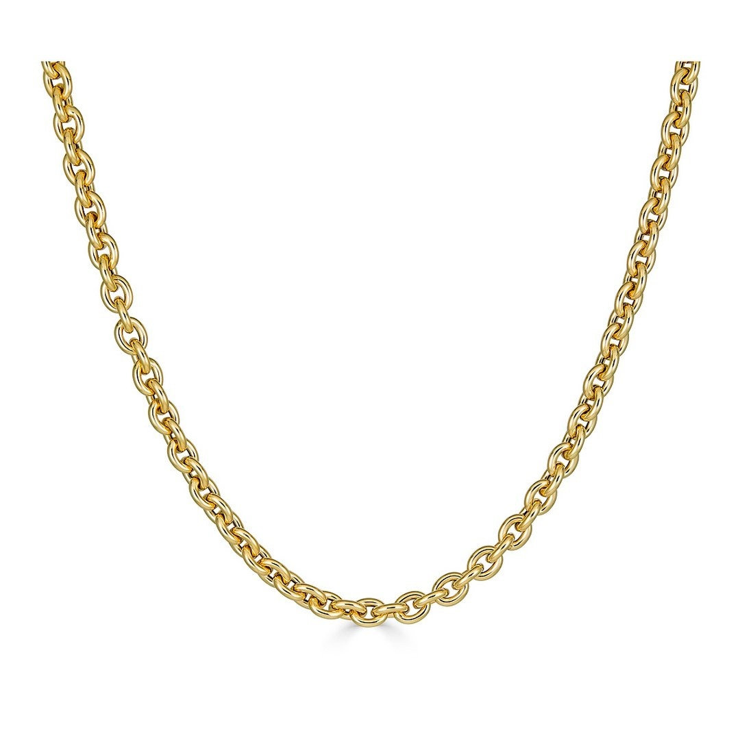 Chunky rolo link necklace of classic contemporary styling. The necklace is crafted in 14k yellow gold and secures with a lobster clasp. It measures 18 inches in length and 5mm in width.