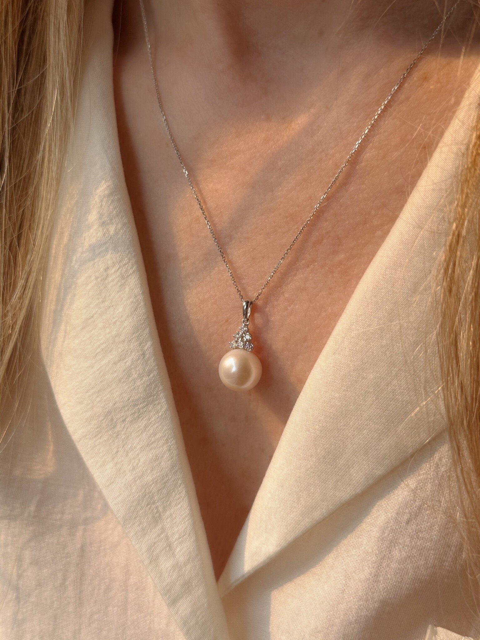 Ladies pearl and diamond pendant of classic styling. The pendant is crafted in 18k white gold and is suspended on a 18k white gold, rolo link necklace. It is set with one cultured pearl at center that measures 9.50 - 10mm in size. It is of very good nacre and lustre. The pendant is also set with six, natural round brilliant cut diamonds that are claw set. These diamonds have a combined diamond weight of 0.09ct, clarity of SI-1 and color of FG. The necklace measures 18 inches in length.