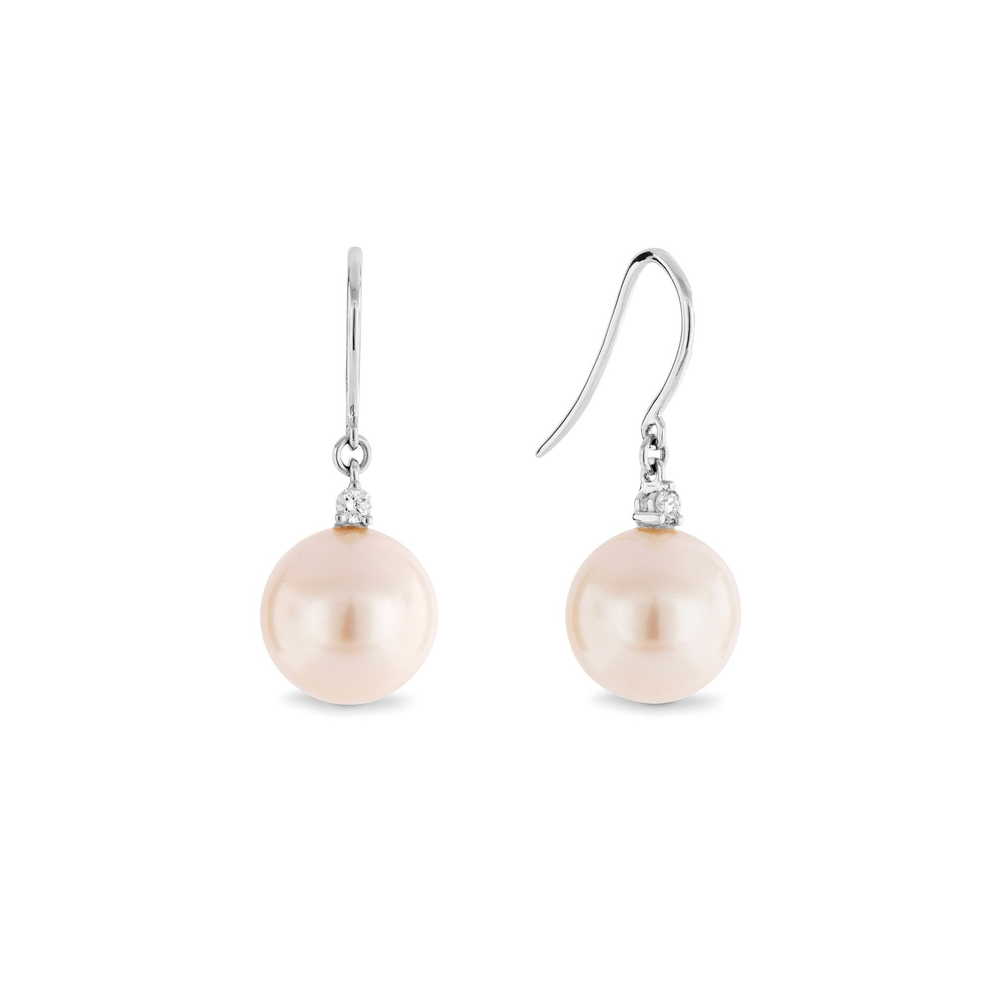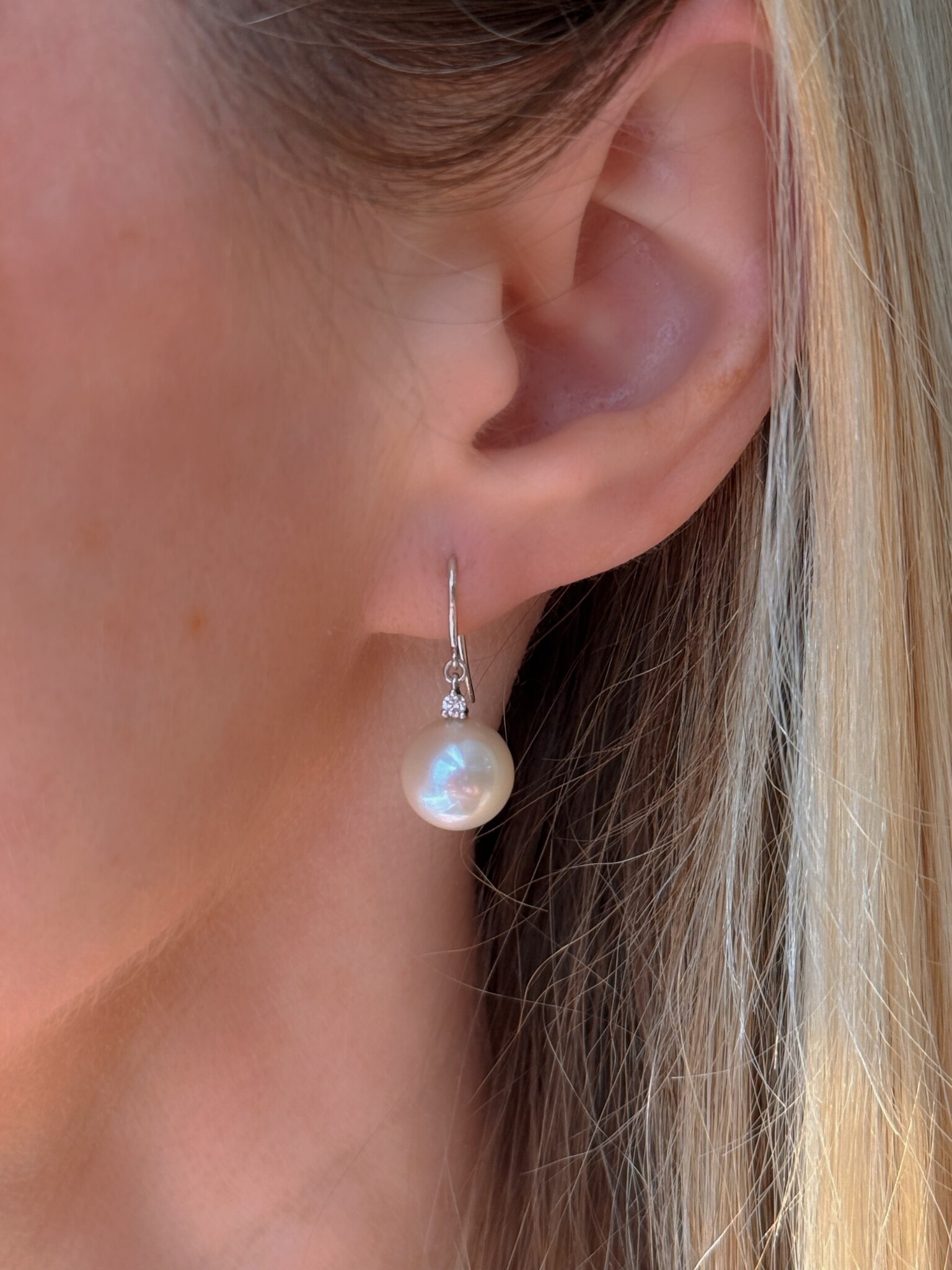 One pair of ladies diamond and pearl drop earrings of classic styling. The earrings are crafted in 18k white gold and suspend by shepherd hook backings. They are set with two cultured pearls and two round brilliant cut, earth mined diamonds. The pearls measure 9-9.50mm in size and are of very good nacre and lustre. The four round brilliant cut diamonds have a combined weight of 0.06ct, clarity of VS-2 and color of G.