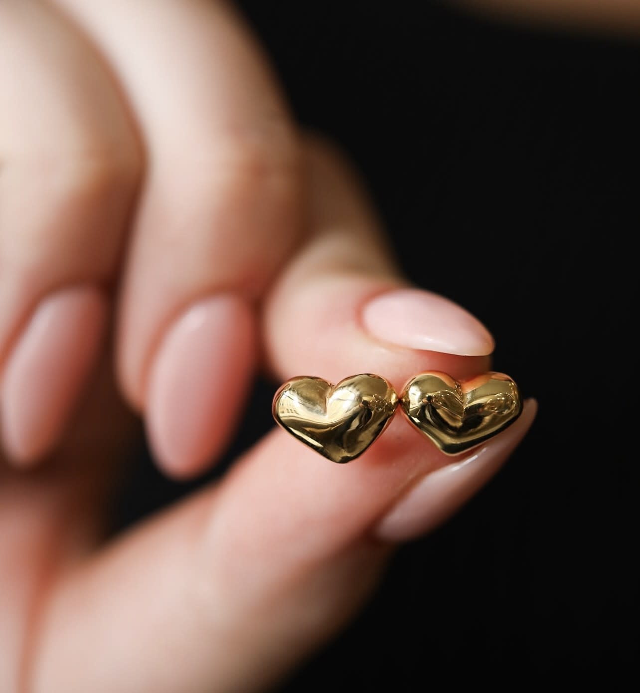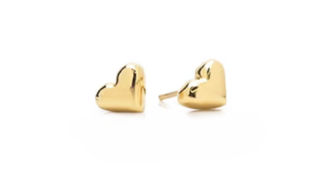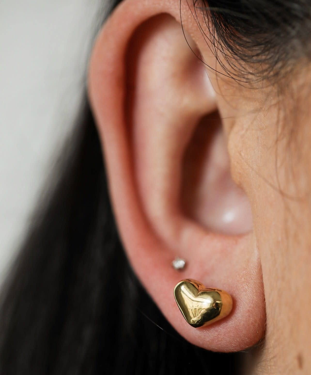 Puffy heart stud earrings of classic contemporary styling. The earrings are crafted in 14k yellow gold and secure with post and butterfly backings for pierced ears. They measure 11.50mm in width and 7.85mm in height. A modern statement stud that is lightweight and easy to wear.