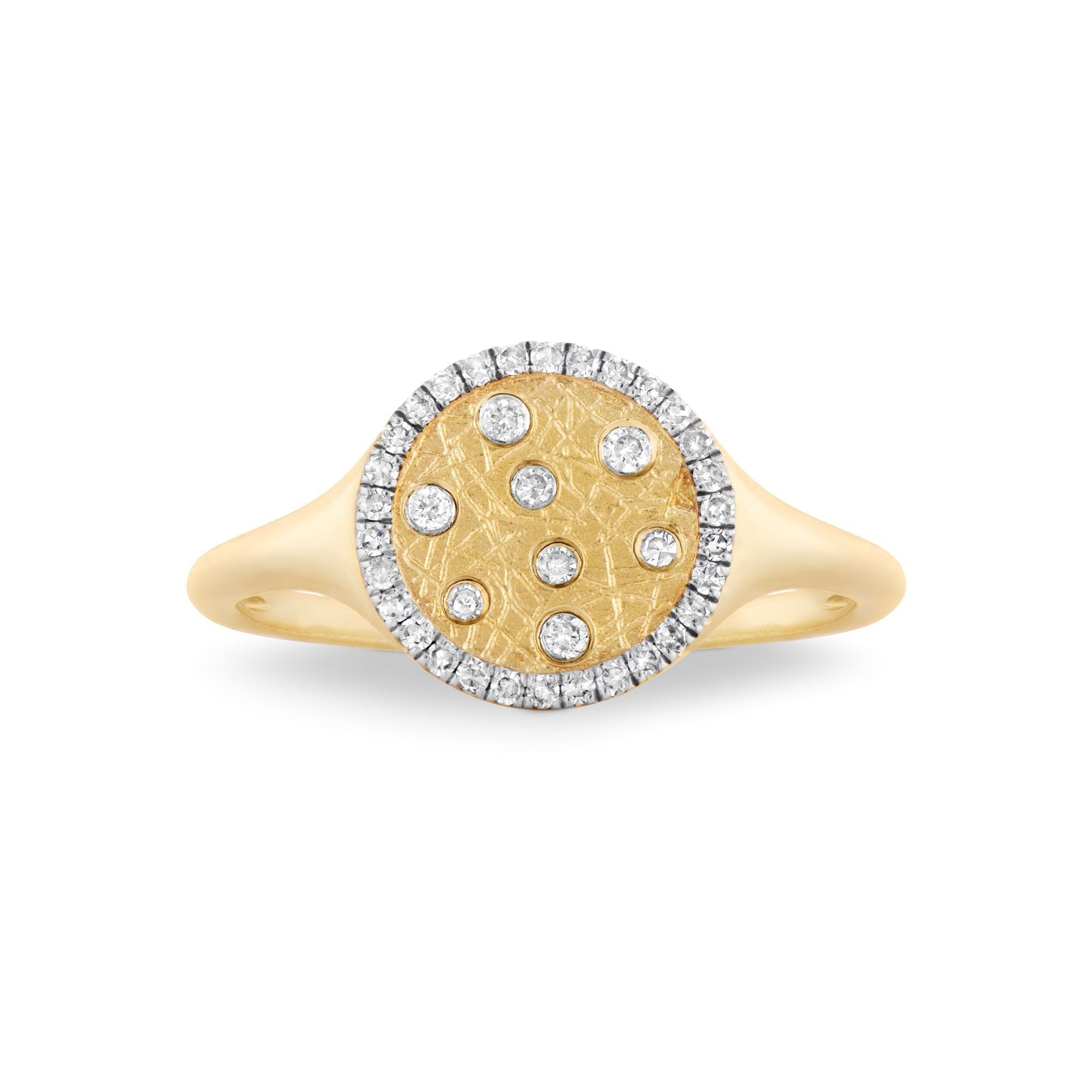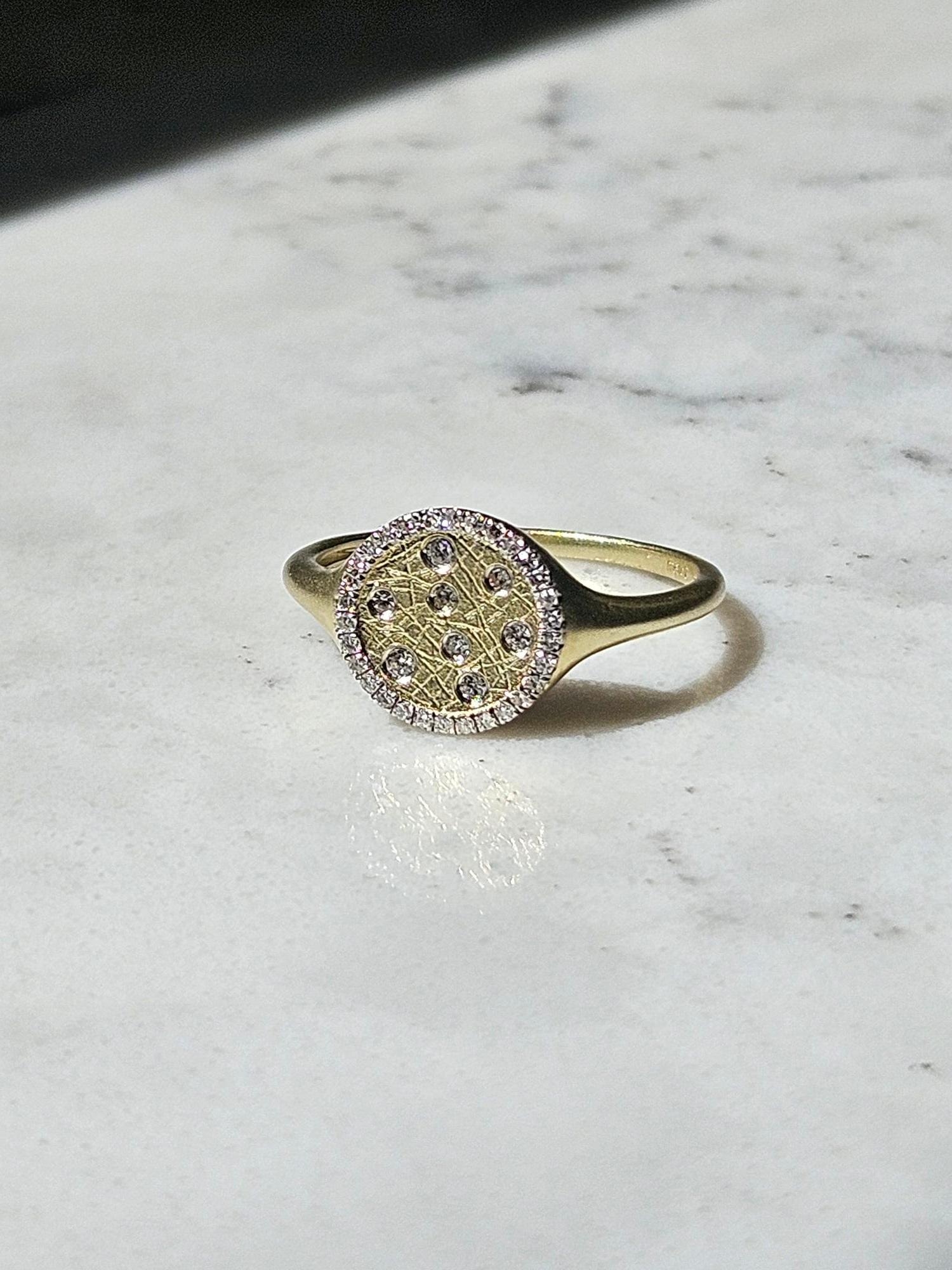 Brushed diamond halo signet ring of contemporary styling. Perfect for the pinky or as a dainty signet style. It is crafted in 14k yellow gold and comprised of a brushed finish appearance. It is set with earth mined, round brilliant cut diamonds that have a combined diamond weight of 0.16ct. They are SI-2 in clarity and GH in color. The signet portion of the ring measures 9.75mm round and the shank of the ring measures 1.35mm under the finger.