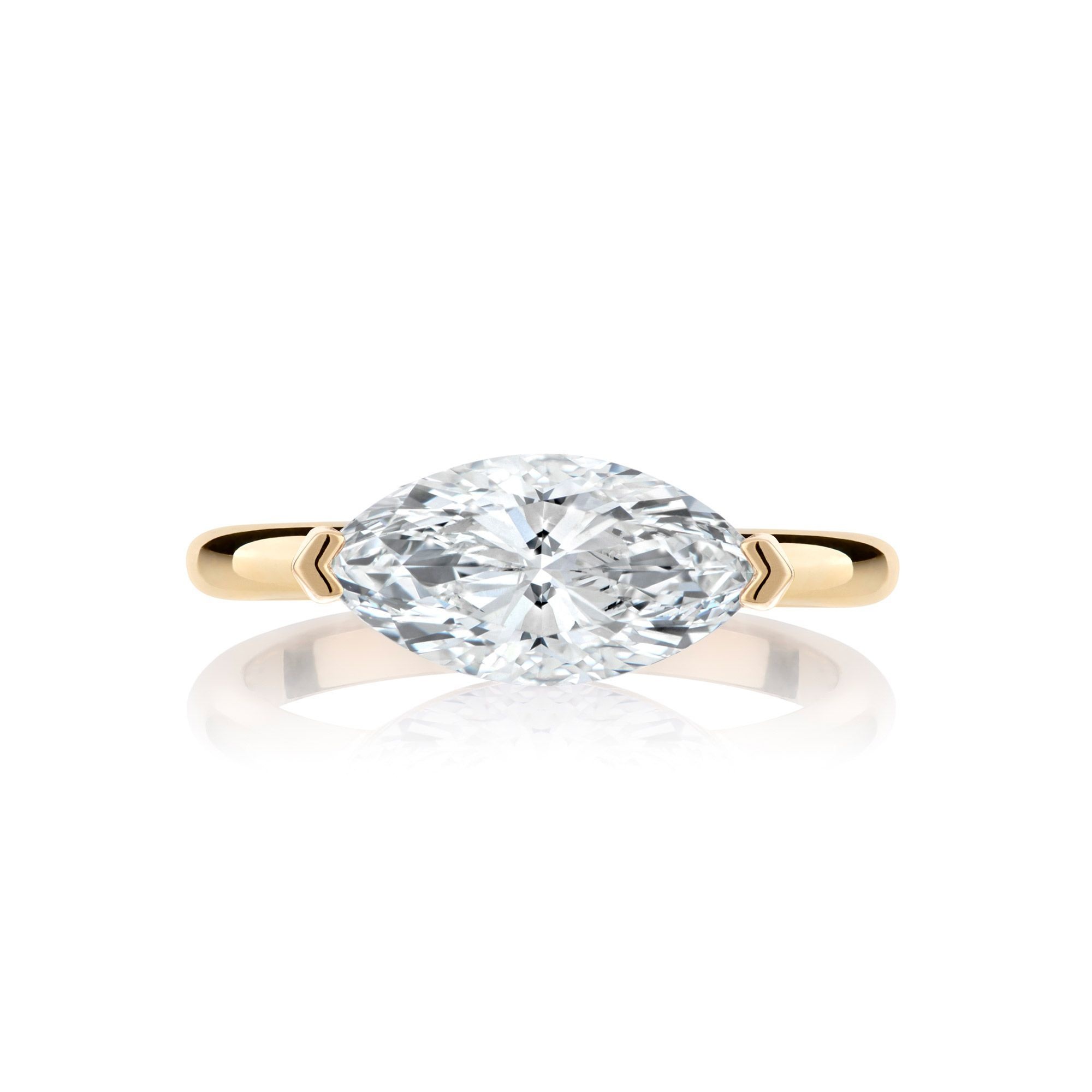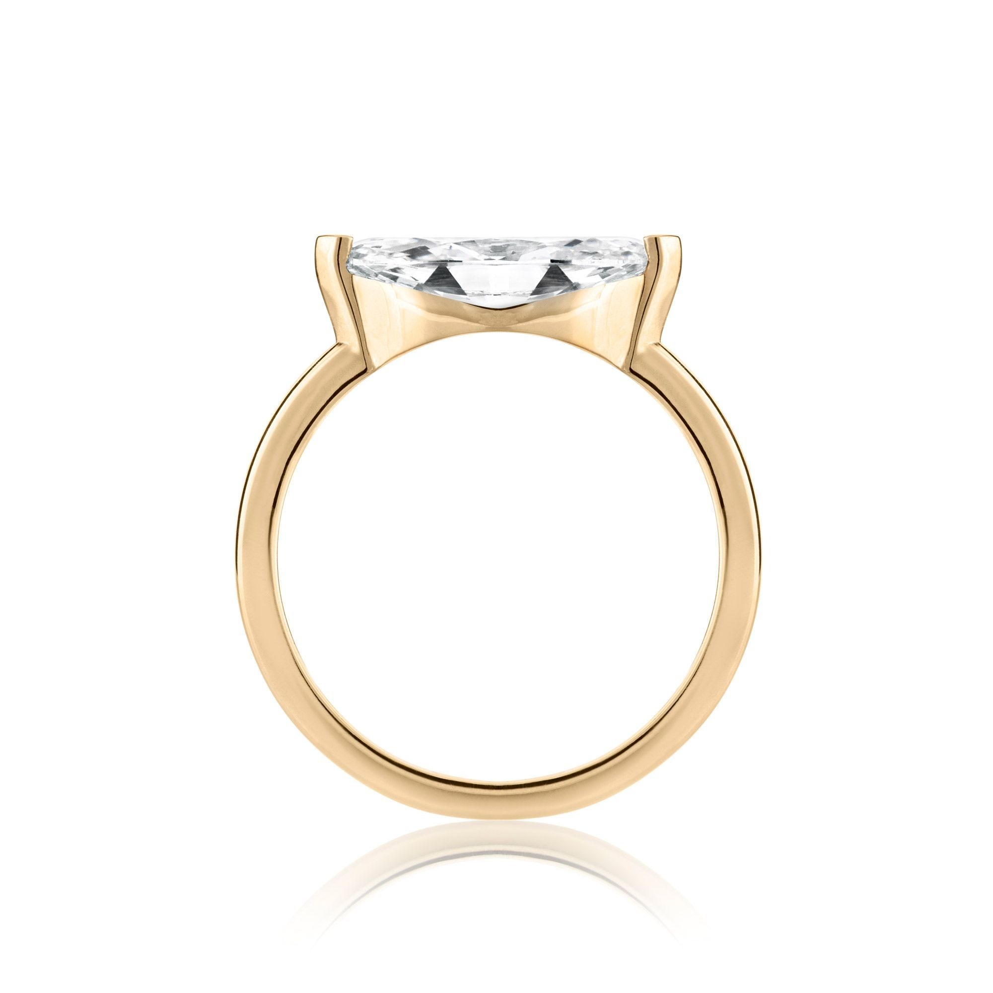 Introducing LAB by Minichiello. Our expertly curated lab created diamond engagement ring and fine jewellery collection. The Riley is one of the more contemporary designs, perfect for a unique statement. It is set with a lab created, marquise cut diamond at center with a weight of 1.74ct. This diamond is VVS2 in clarity and D in colour with an Excellent cut. This diamond is semi bezel set in an east-west orientation which adds to the contemporary styling. The remaining shank of the ring is tiffany in shape and high polish in appearance.