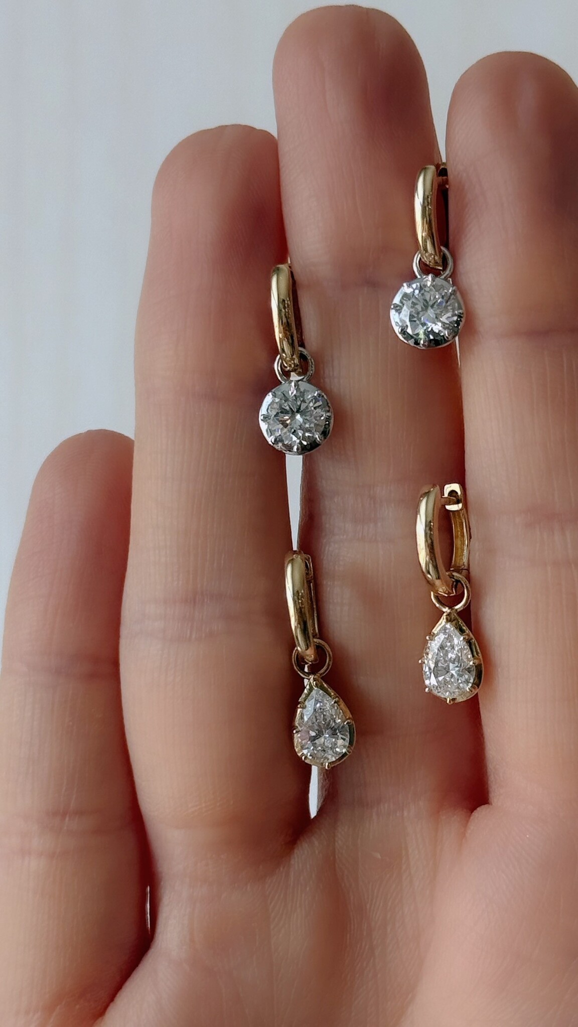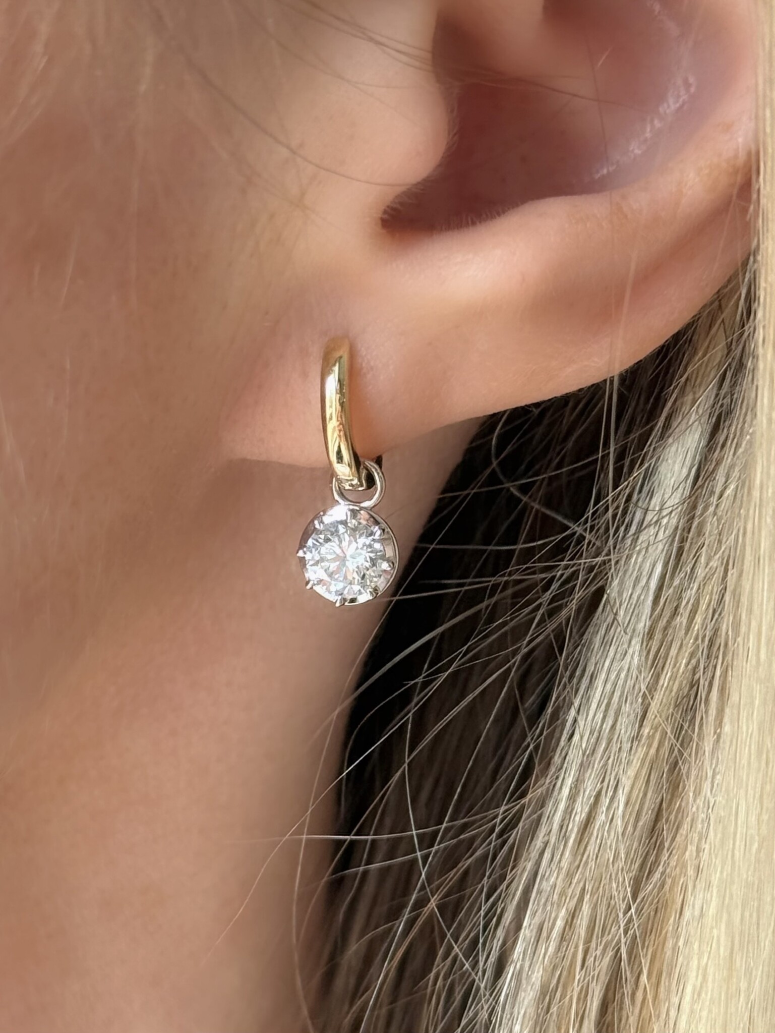 LAB created round brilliant cut diamond button back earrings of classic styling. The earrings are crafted in 14k yellow and white gold and secure with huggie style clasps. They are set with two matching, lab created round brilliant cut diamonds in button back settings. These diamonds have a combined weight of 1.00ct, clarity of VS-1 and color of FG.