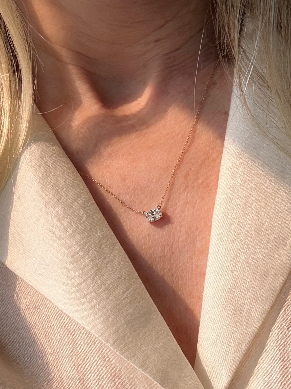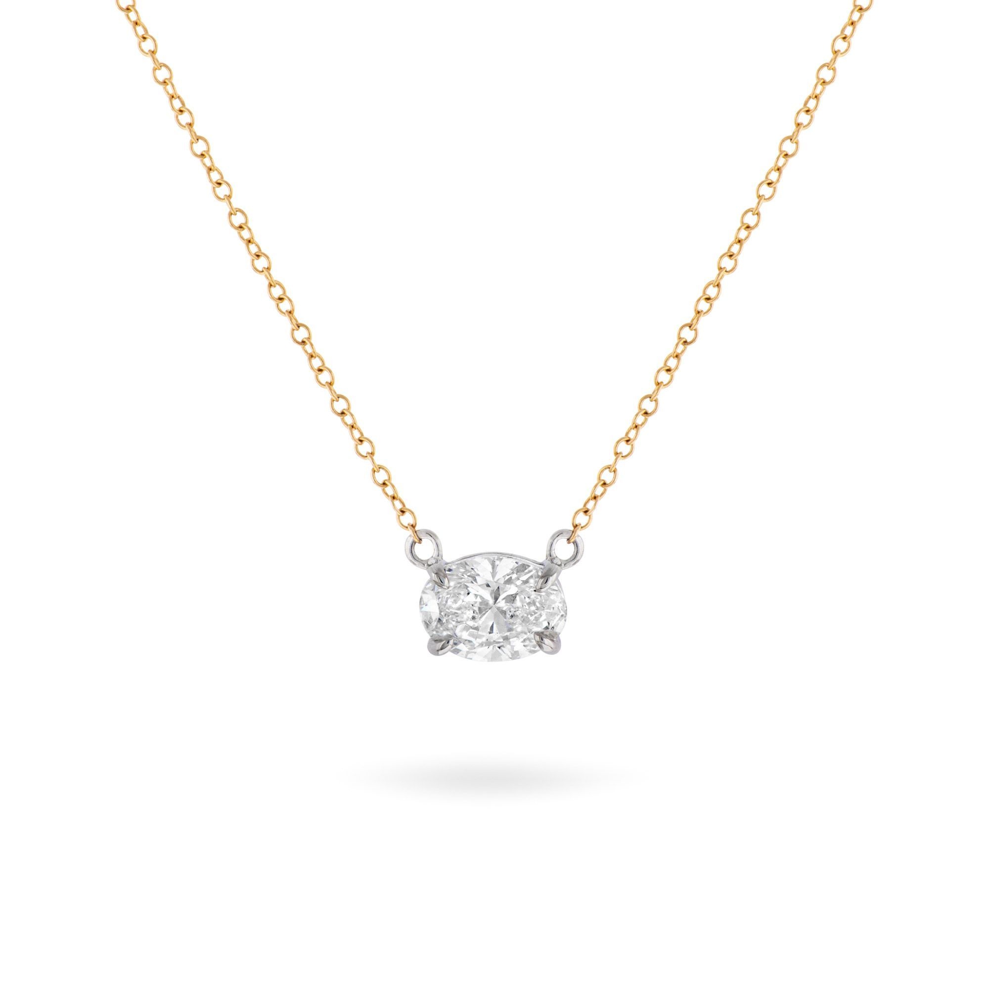 LAB created oval cut diamond pendant of classic contemporary styling. The pendant is crafted in 14k yellow and white gold and is suspended on a rolo link necklace. This necklace is 18 inches in length and is comprised of one length adjuster at 17 inches. It is set with one lab created, oval cut diamond at center in a white gold head. This diamond has a weight of 0.50ct, clarity of VS-2 and color of F.