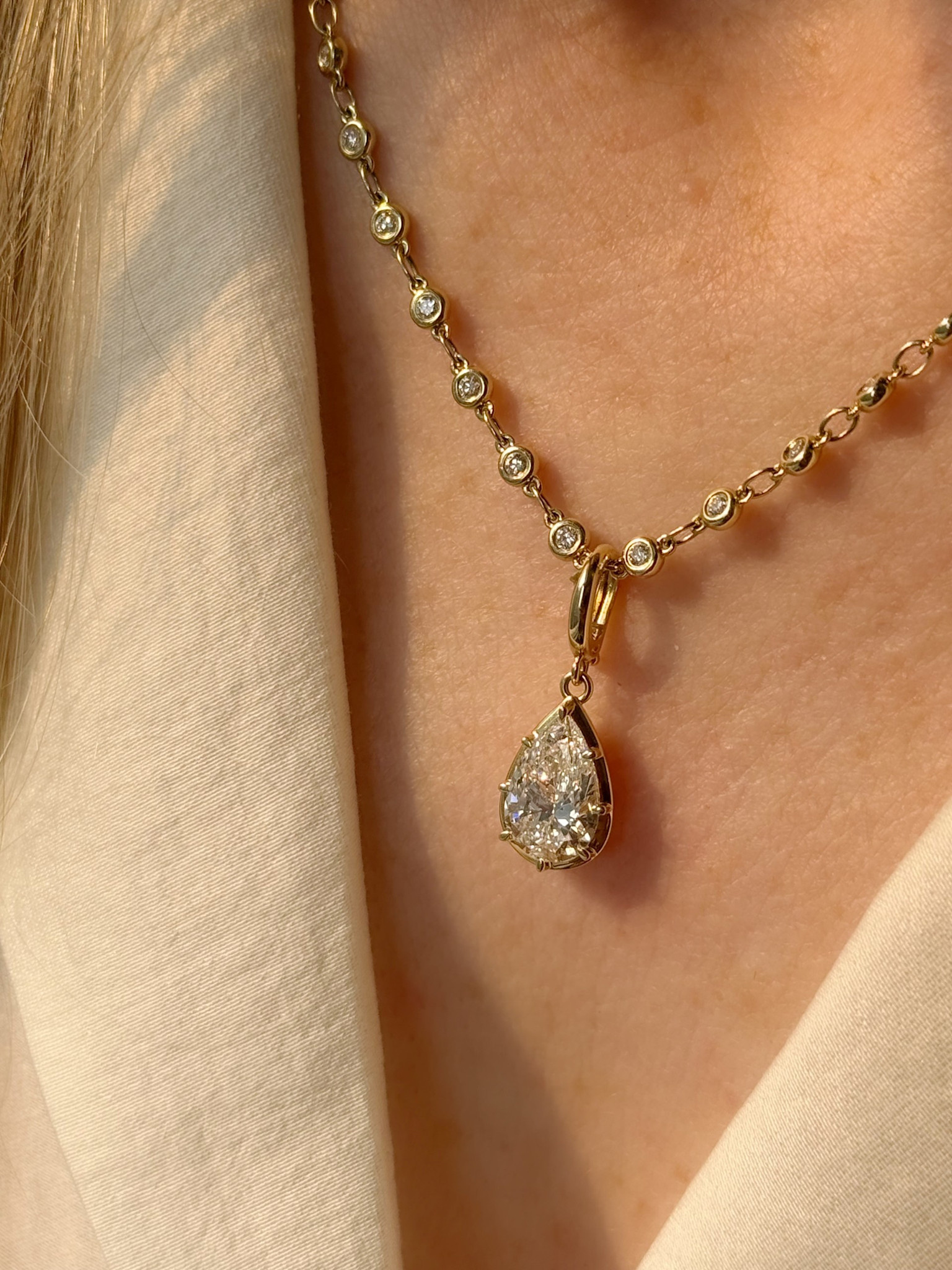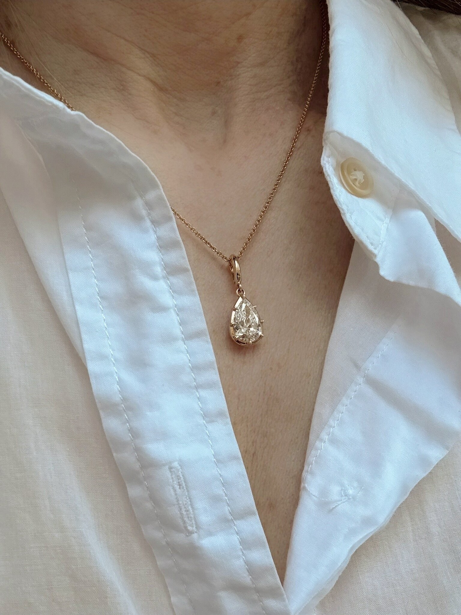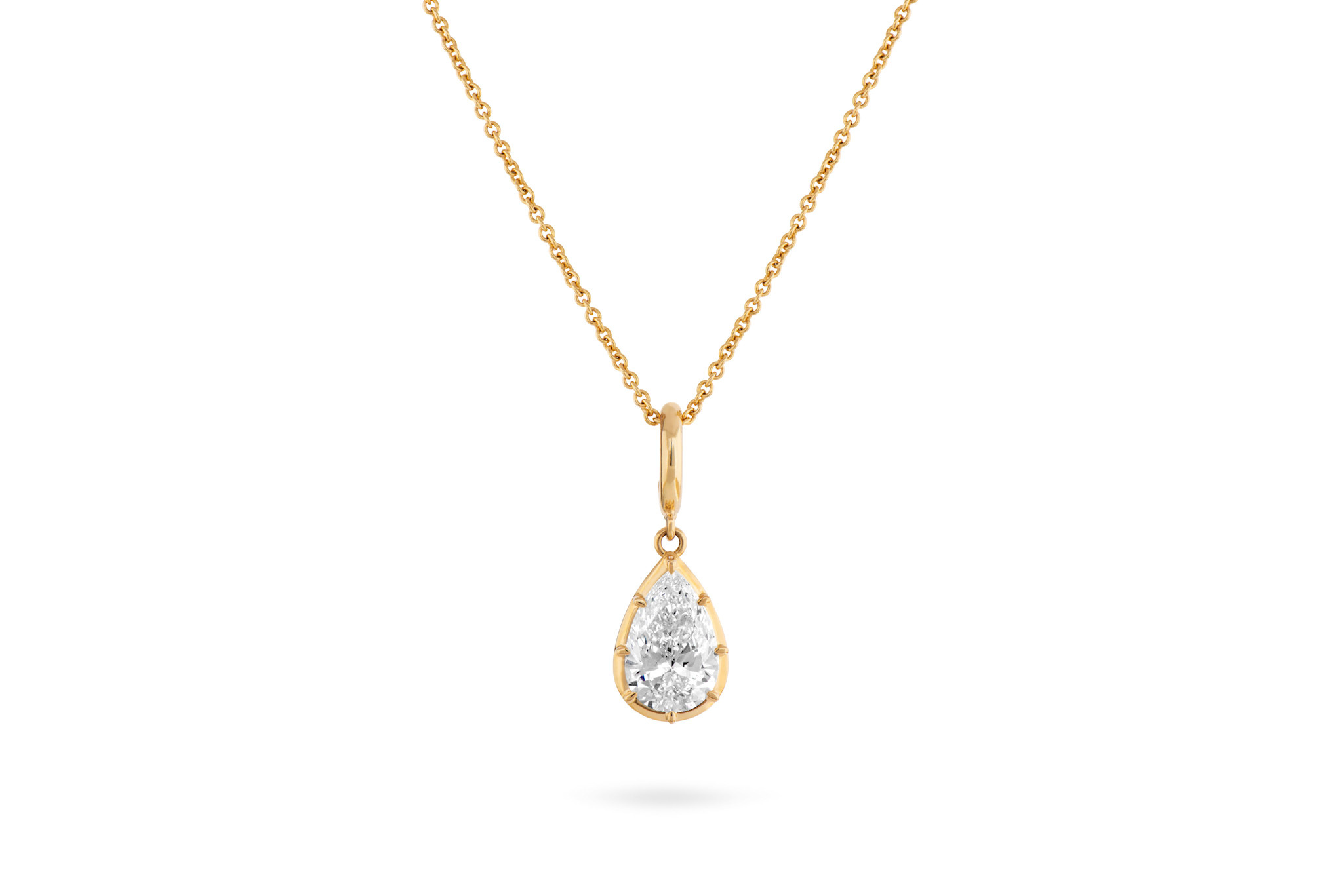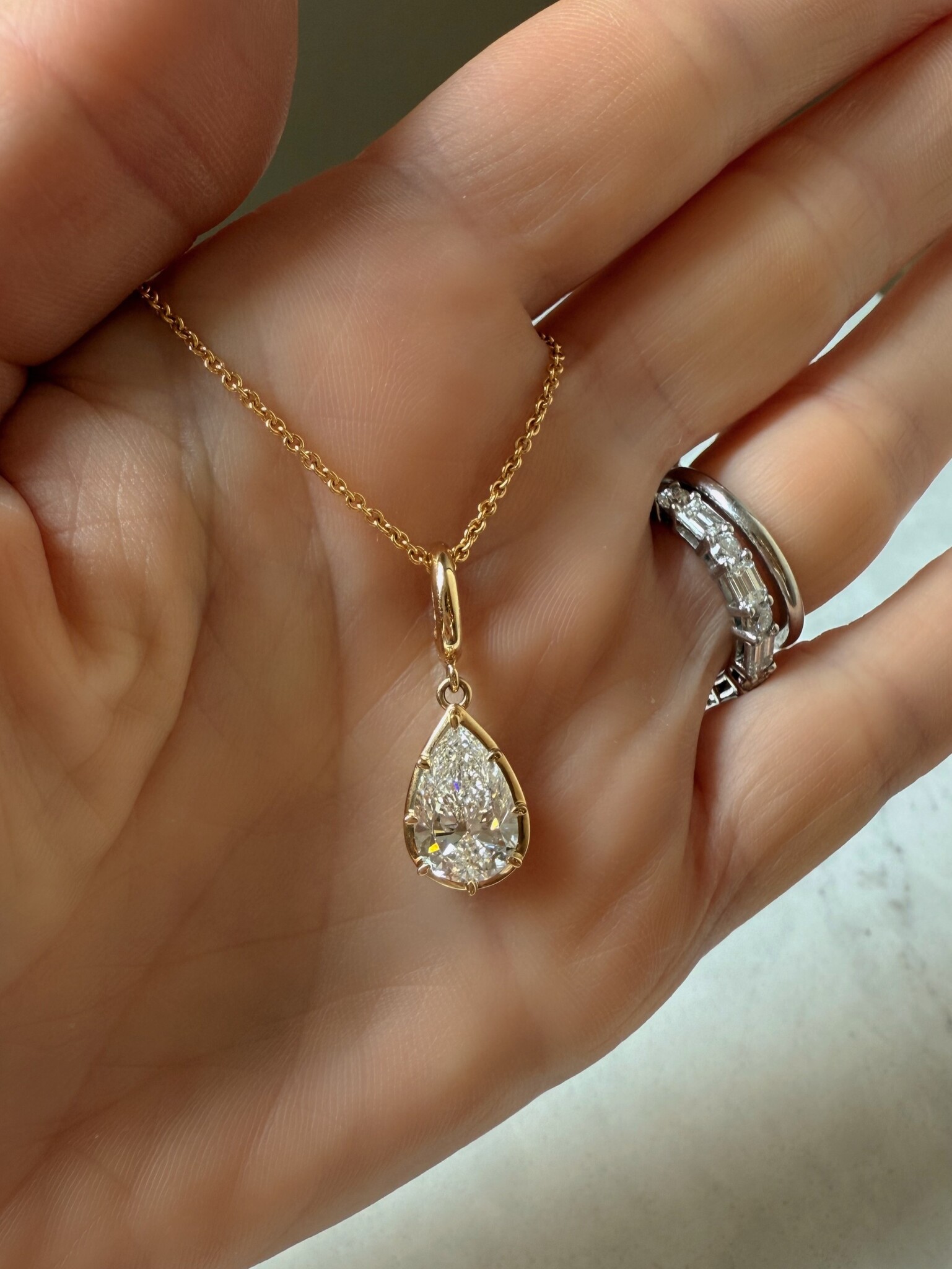 LAB created pear shape diamond button back pendant of classic styling. The pendant is crafted in a combination of 14k white and yellow gold and is suspended by an enhancer style bale. It is set with one lab created, pear shaped diamond at center with a weight of 2.00ct. This diamond has clarity of VS-2 and color of F, with an excellent cut. It is six claw set in yellow gold in a button back design. The necklace that suspends the pendant is crafted in 14k yellow gold, measures 18 inches in length and is rolo link in style.